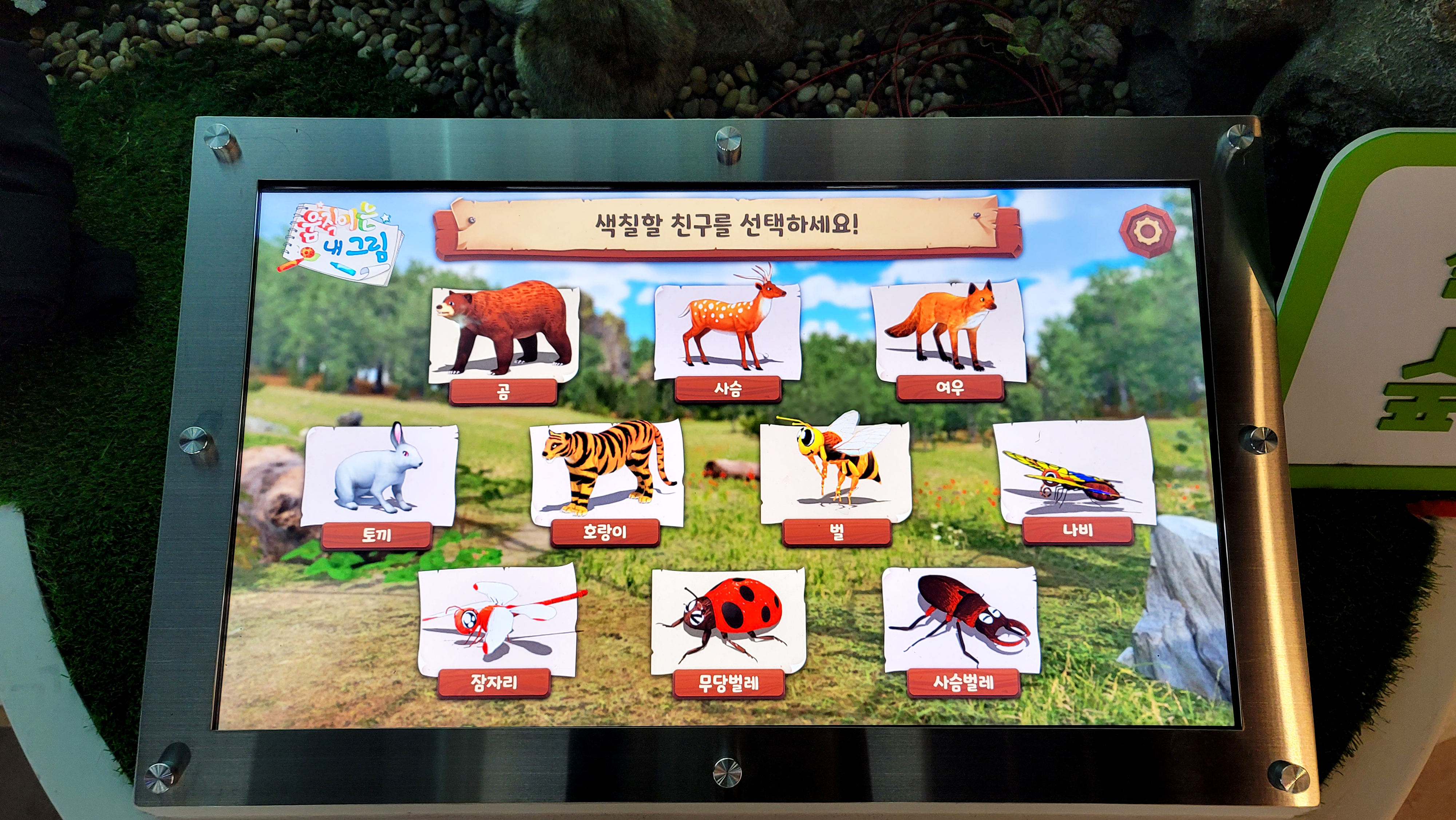 키오스크를 통해 동물을 선택하고 색칠한 뒤 디지털 숲에 등장시키는 참여형 경험을 제공합니다.