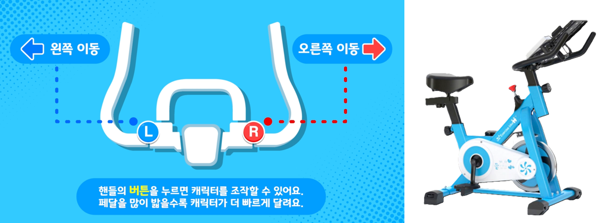 상상 바이크는 자전거를 사용해 여러 조작이 가능한 신체 활동 콘텐츠 입니다.